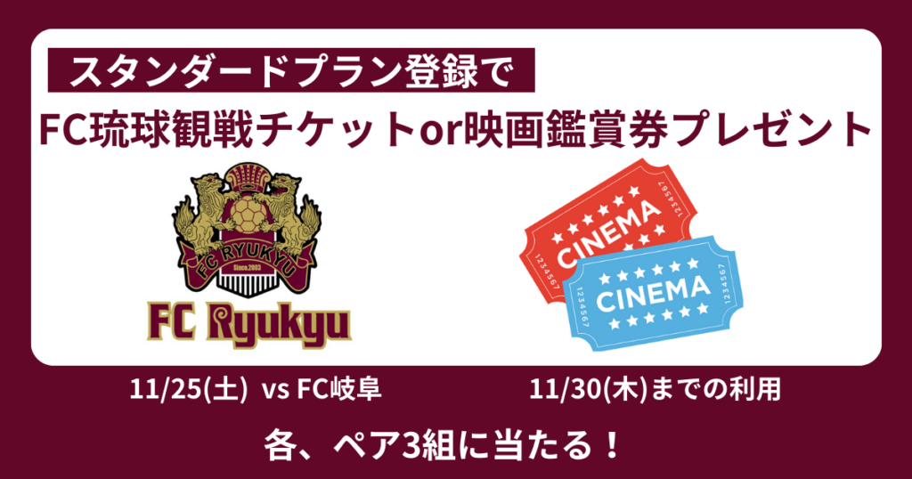 「FC琉球」の試合観戦チケット又は映画鑑賞券をそれぞれペア3組6名様にプレゼント!