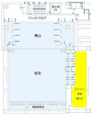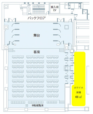 ・客席面積:335㎡ ・客席天井高さ:7.8m ・舞台開口:13m×5m ・楽屋:[3F]16人[4F]20人 ・ホワイエ面積:68㎡ ・ホワイエ天井高さ:3.5m ・利用時間:午前9時~午後10時