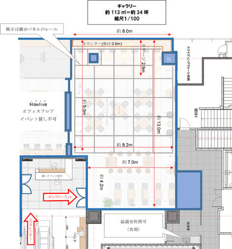 ギャラリー面積:113㎡ テーブル・座席配置:約30席 ギャラリー形式:用途に応じて対応可