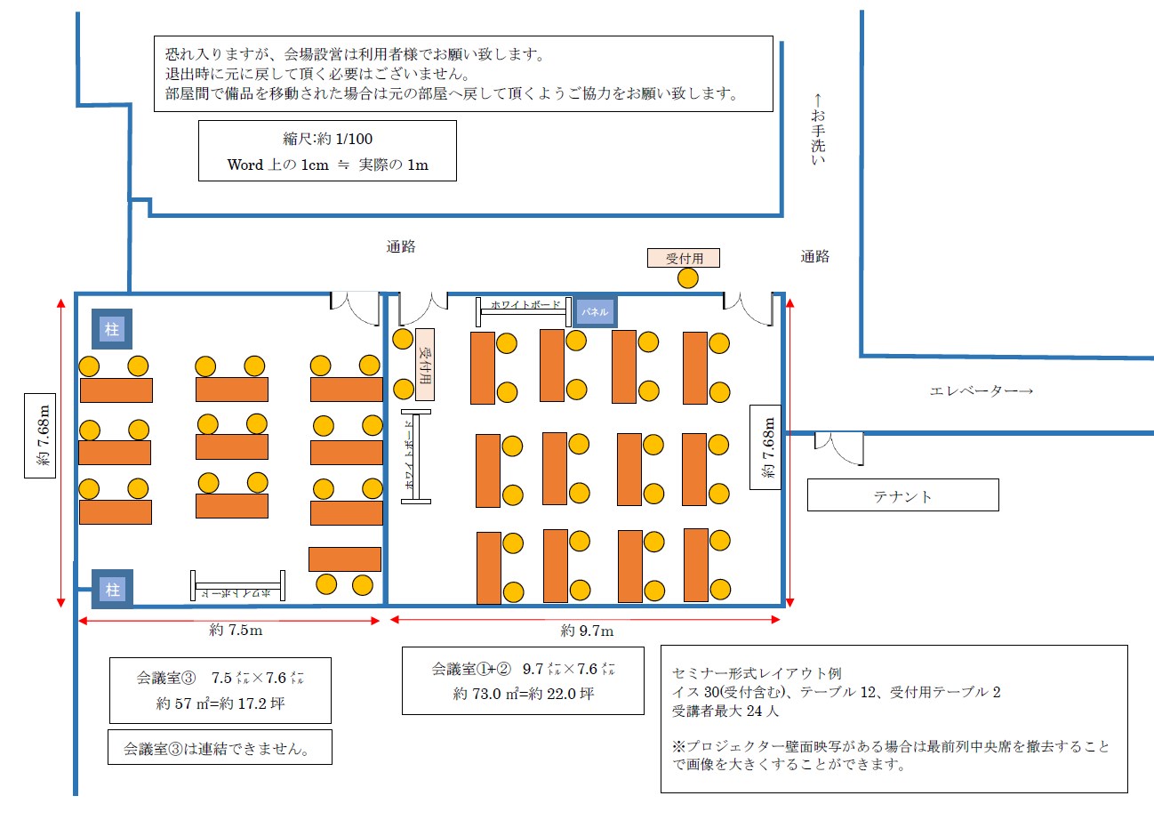 | 会議室1 | 37㎡ | 3,300円 | 午前9時~ 午後6時(要相談) |