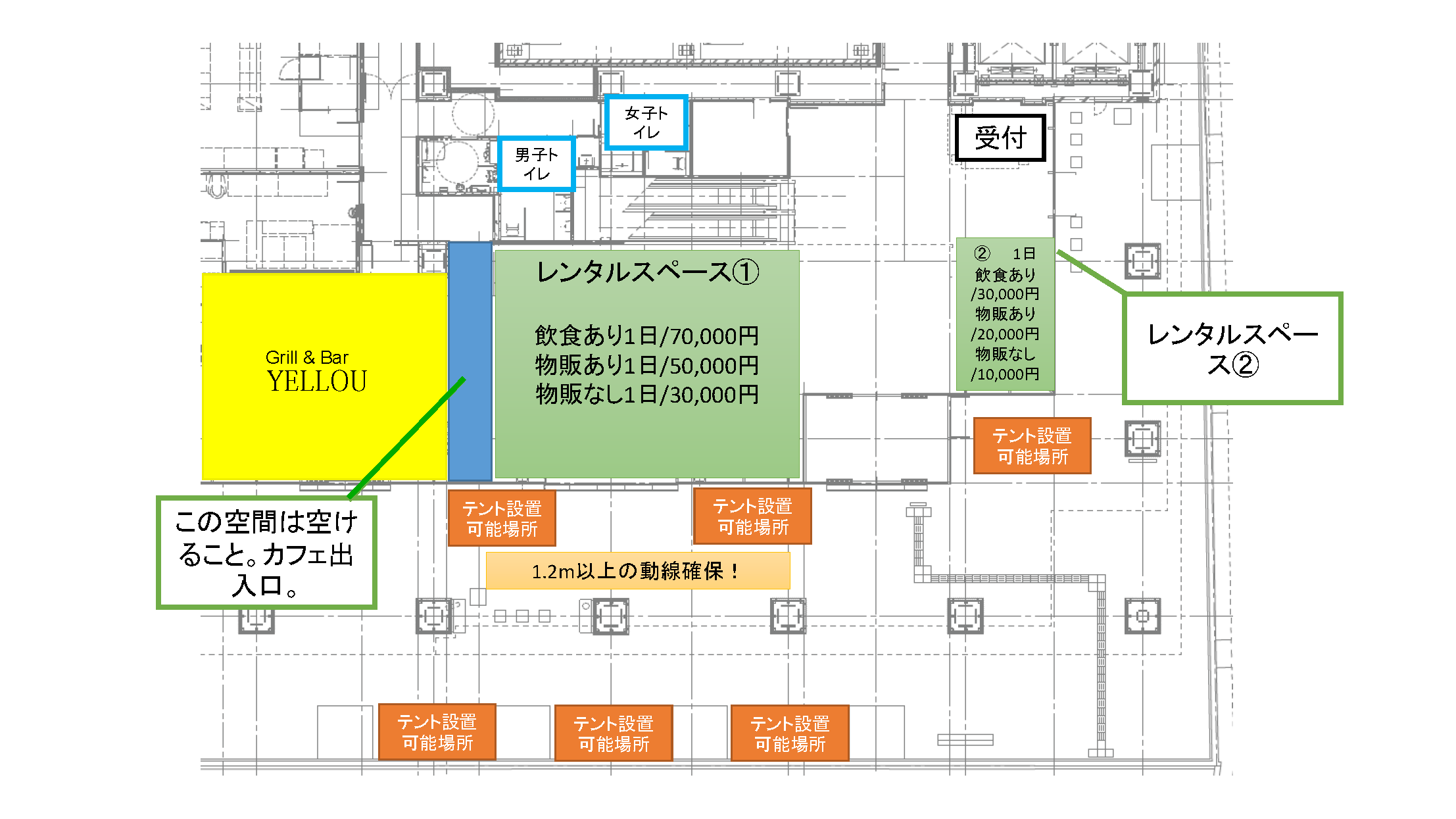 エントランスは屋外と連結したスペースがあり、新車の展示販売や地域の物産展、ビアガーデンなど幅広い催し物に対応できるスペースです。キッチンカーによる移動販売など、オフィス街の交流空間となっています。 また、 1階入居の Grill&BarYELLOU とのコラボレーションで、イベントの規模拡大、質向上を図ることも可能です。