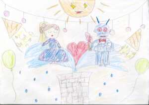 タイトル:ふんすいに浮かぶロボットと人間の結婚式