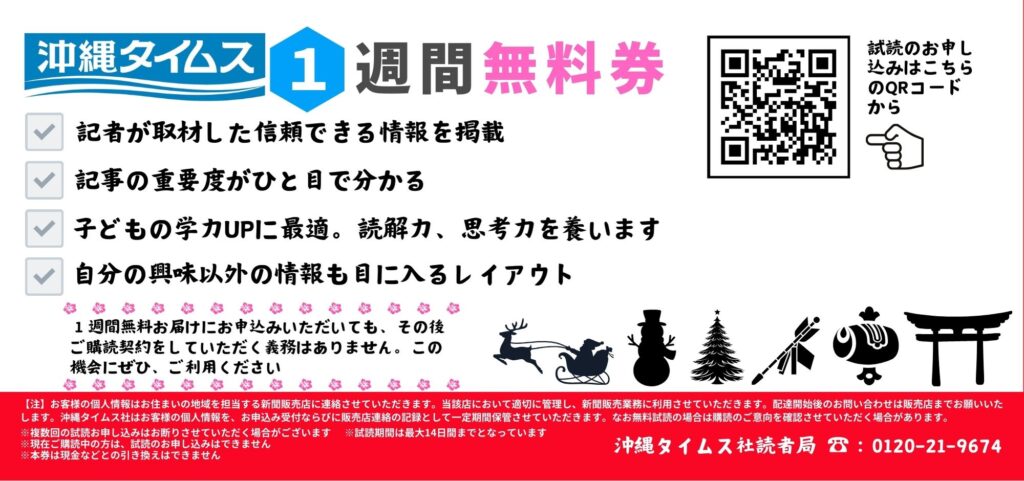 沖縄の最新ニュースから地域の魅力まで、沖縄タイムスを一週間無料でお楽しみいただけるチャンス!