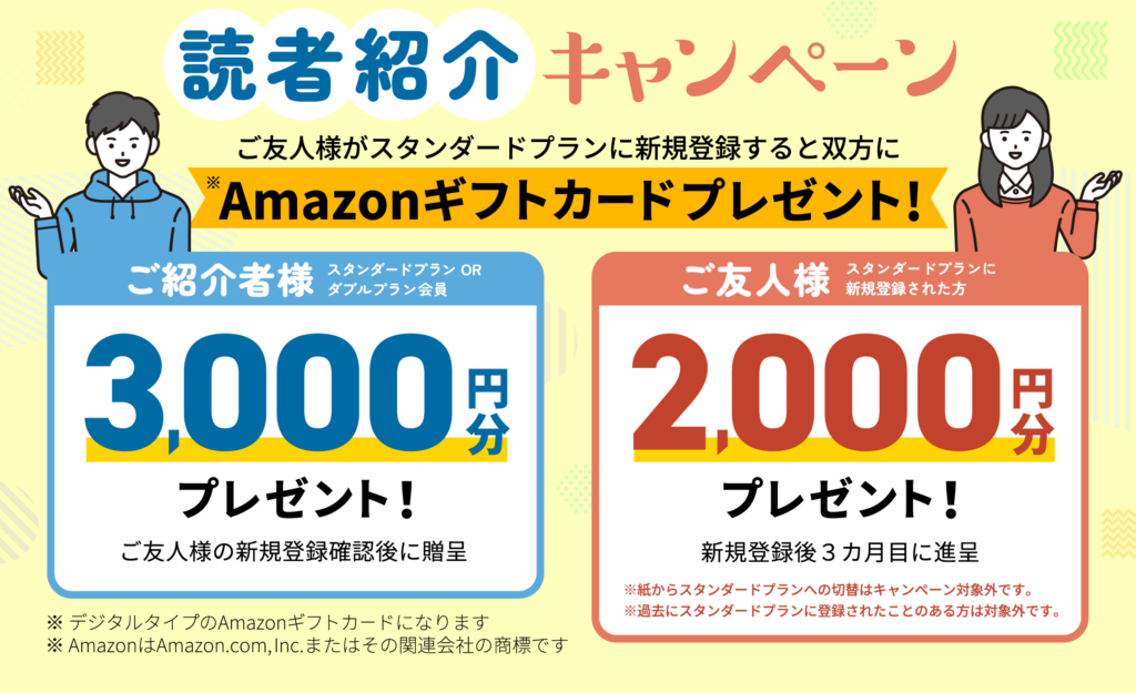 現在、スタンダードプラン(電子のみ) または ダブルプラン(紙+電子) をご利用の方を対象に、読者紹介キャンペーンを実施しています。