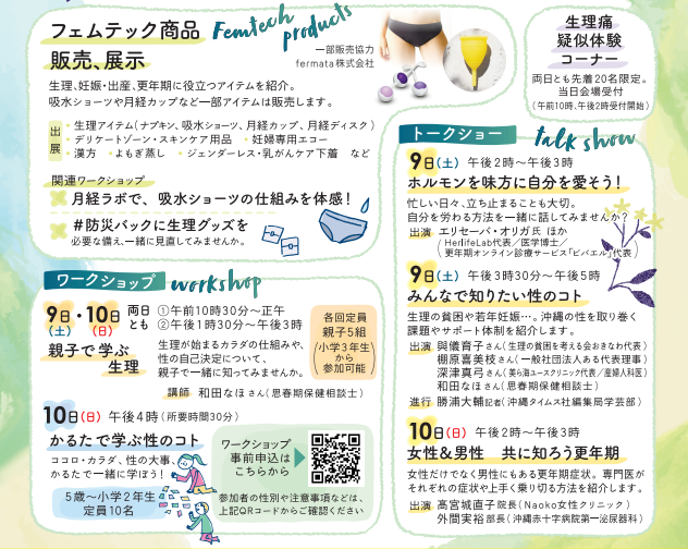 | 9日15:30~ | 「みんなで知りたい性のコト」 生理の貧困や若年妊娠・・。それらに取り組む団体が、県内の現状やサポート体制を紹介します。 | 出演:與儀育子(生理の貧困を考える会おきなわ代表)/棚原喜美枝(一般社団法人ある代表理事)/深津真弓(美ら海ユースクリニック代表)/和田なほ(思春期保健相談士) 進行:勝浦大輔(沖縄タイムス社編集局学芸部記者) |