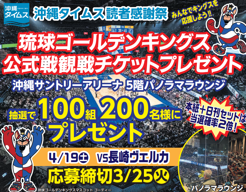 読者の皆様のご要望に応え、またまたやります沖縄タイムス「読者感謝祭」‼ 琉球ゴールデンキングス公式戦観戦チケットが100組200名様に当たる! 締め切りは2025年3月25日(火)まで。お早めにご応募ください。 お申し込みは下記から。