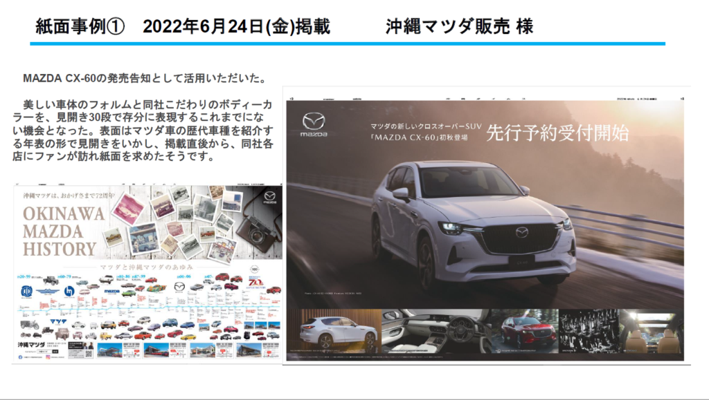 インターネットの普及に伴い便利な時代になった一方、真偽不明の情報も飛び交うようになっています。弊社では、これまで培った信頼をベースに、「いままでになかった価値を提供する」「沖縄の発展に貢献する」という想いを込め、最新鋭機導入を機に、新たな広告施策を提案いたします。