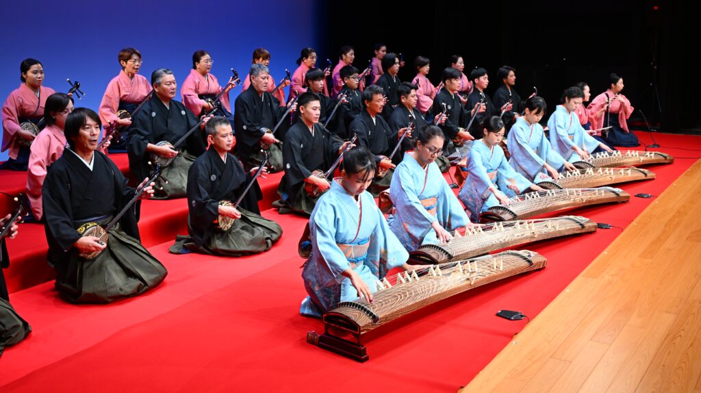 2025年度の「選抜芸能祭」で幕開けの古典音楽斉唱を演奏する優秀賞入賞者ら