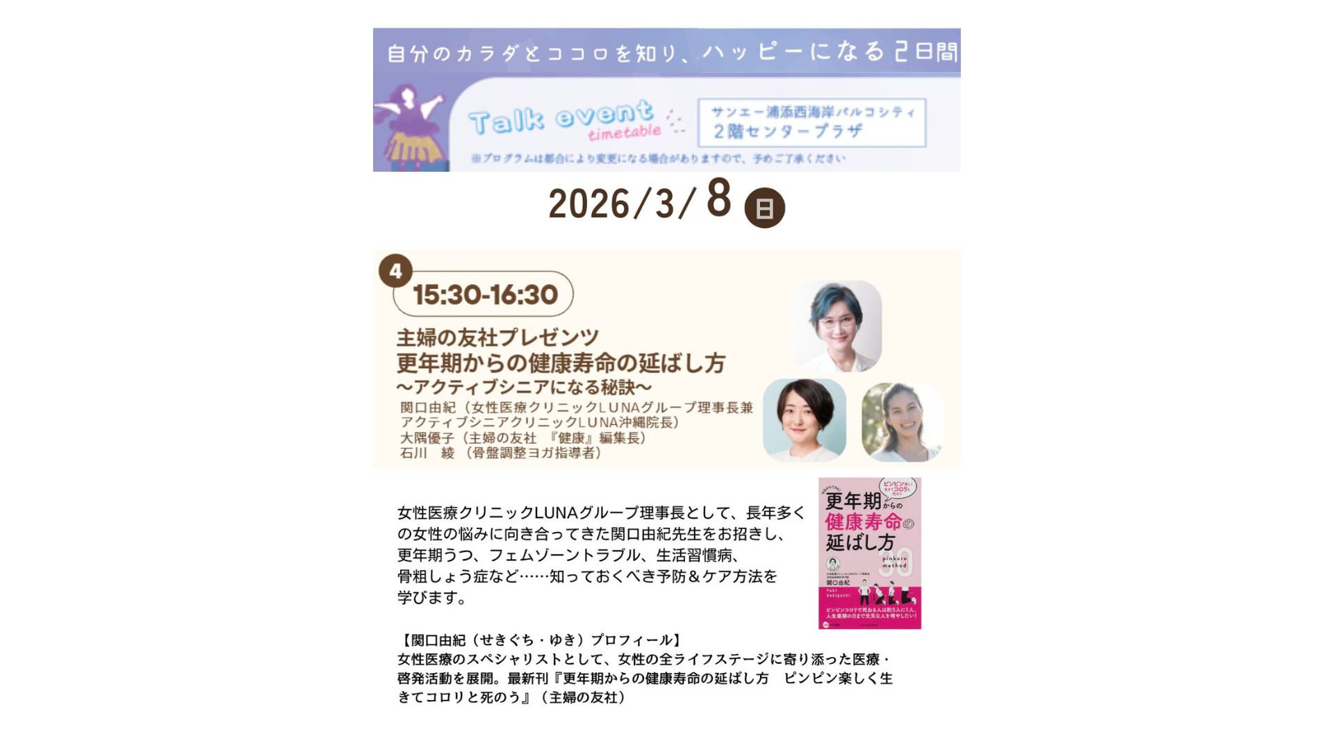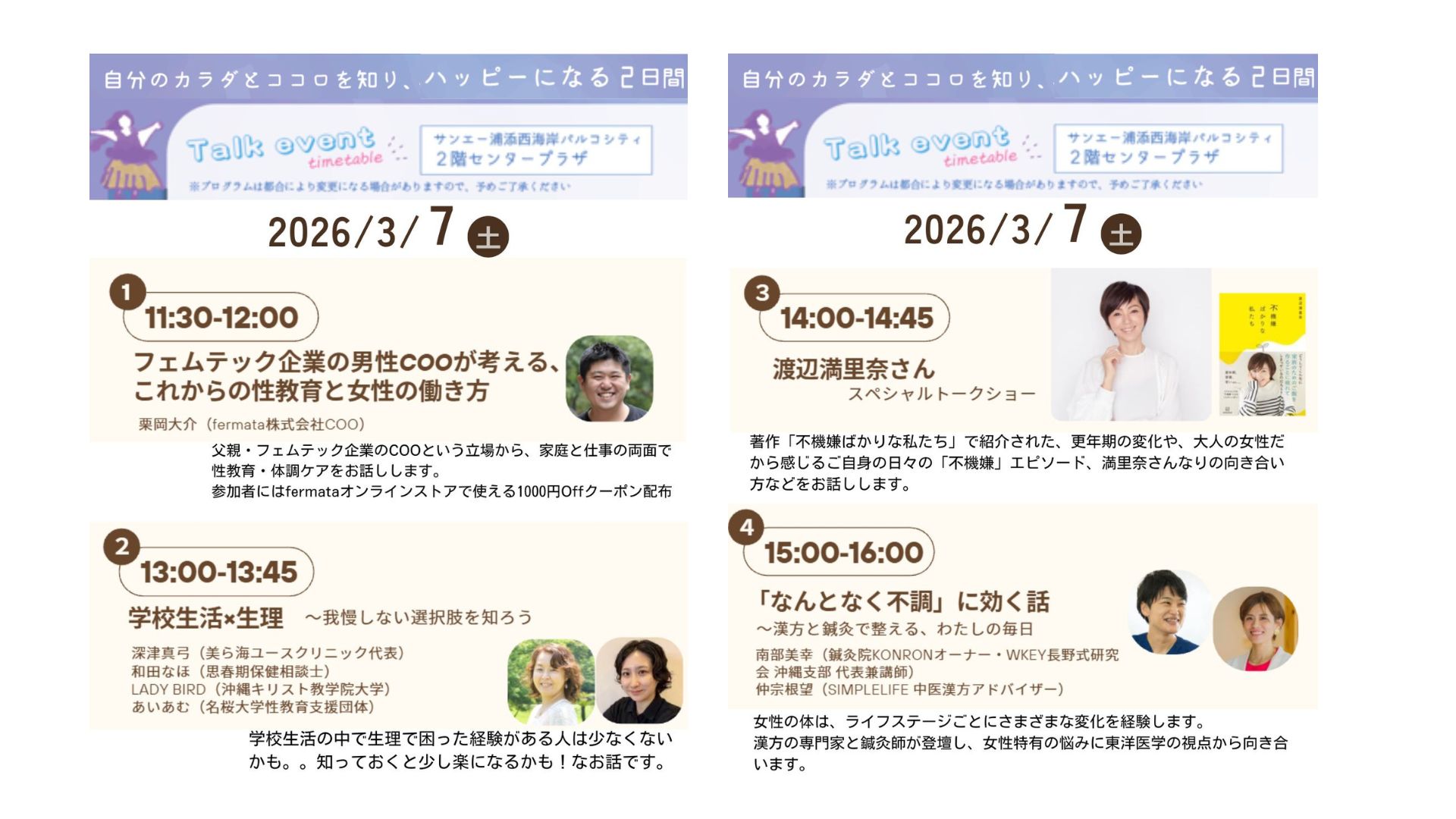 生理や更年期など女性特有の健康課題の解決と女性のエンパワーメントを目的に3月7日(土)、8日(日)、サンエー浦添西海岸パルコシティで「国際女性デー×フェムテックVol4」を開催します。