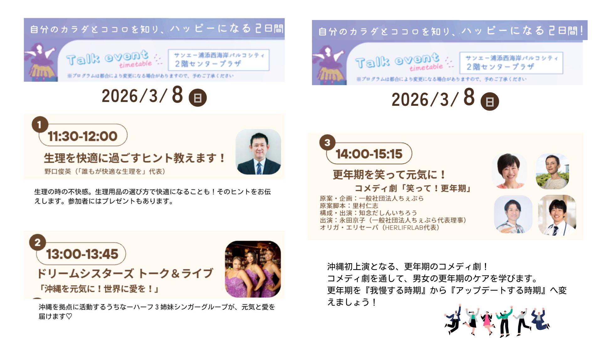 吸水ショーツやデリケートゾーンケアなどフェムテック商品の展示販売のほか、トークイベント、親子で学べる性教育や、ワークショップ、女性社長マルシェなども同時開催します。入場無料。
